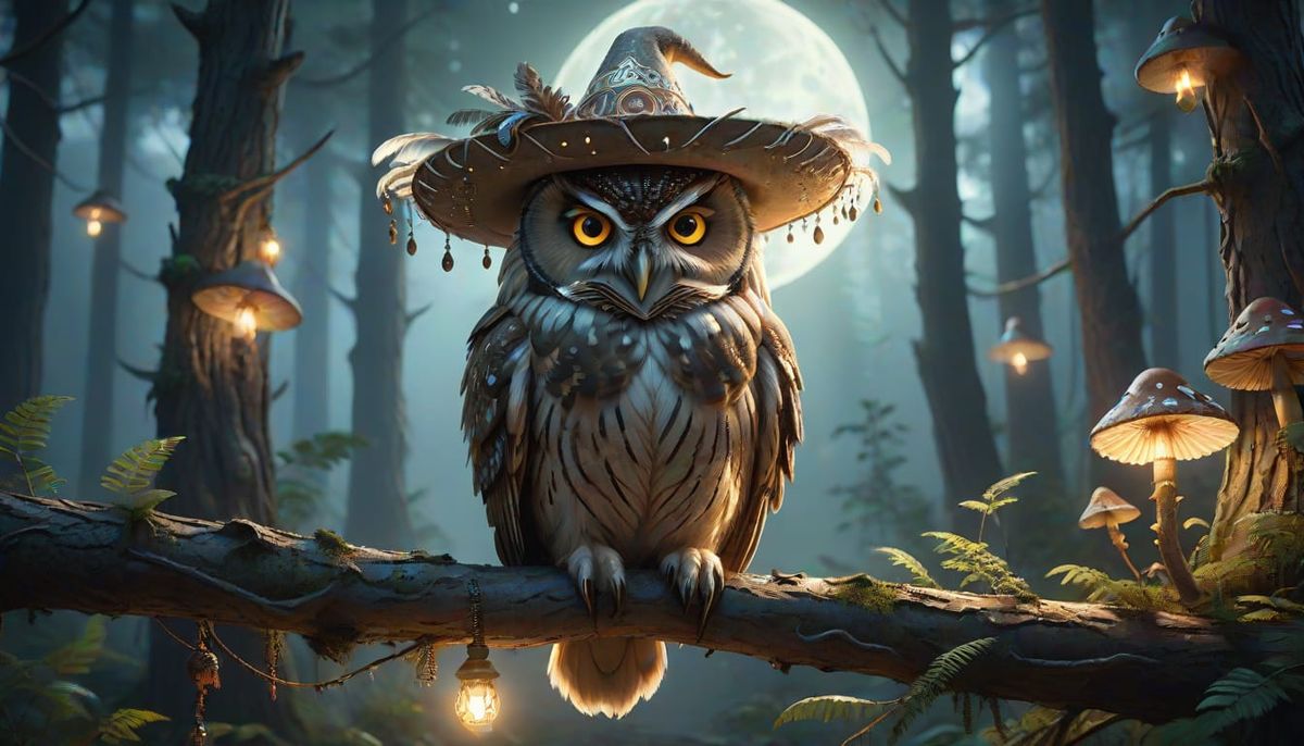 A striking picture of an owl wearing a sombrero in a moonlit forest. The owl's eyes gleam with wisdom in the mystical setting, with glowing mushrooms and soft, ethereal lighting.