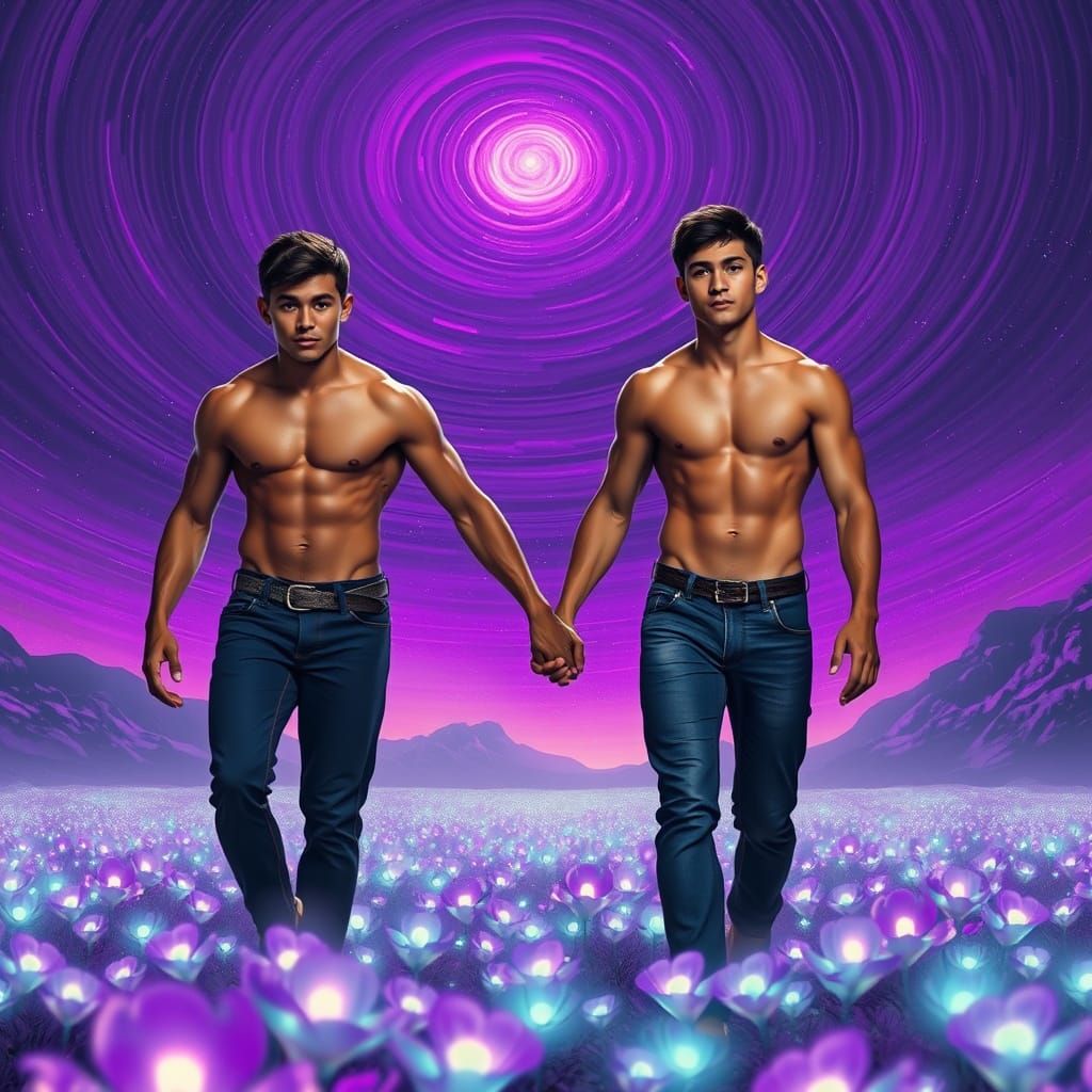 This image shows two muscular young men holding hands on an alien planet under swirling purple skies. The landscape features glowing, bioluminescent flora and is rendered with surreal and cosmic artistic elements.