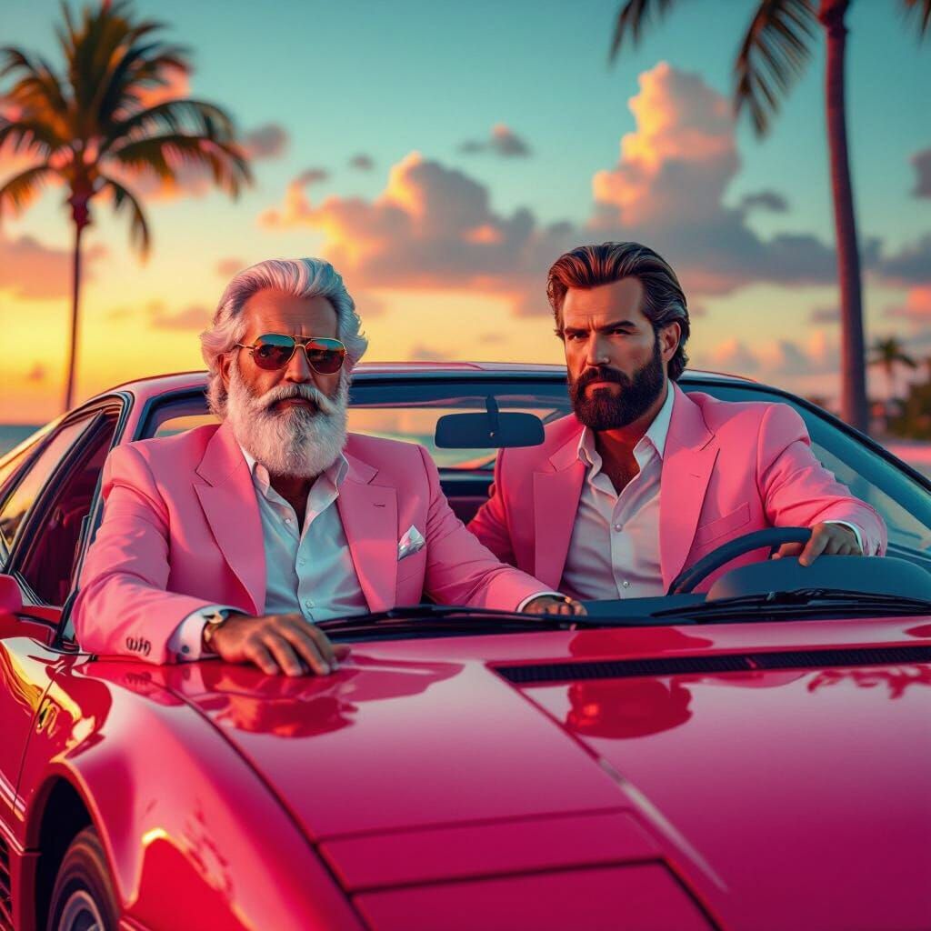 This image shows Karl Marx and Friedrich Engels in 1980s attire, posing like Crockett and Tubbs inside a red Ferrari Testarossa. The scene captures a vibrant, neon-lit Miami Vice aesthetic with cinematic lighting and photorealistic detail.