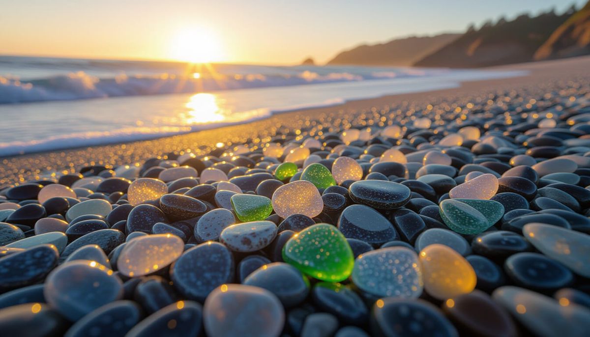 An aerial view of Glass Beach, Fort Bragg, California, showcasing colorful sea glass pebbles illuminated by warm golden hour light. Photorealistic splash art with intricate details and vibrant color depth.