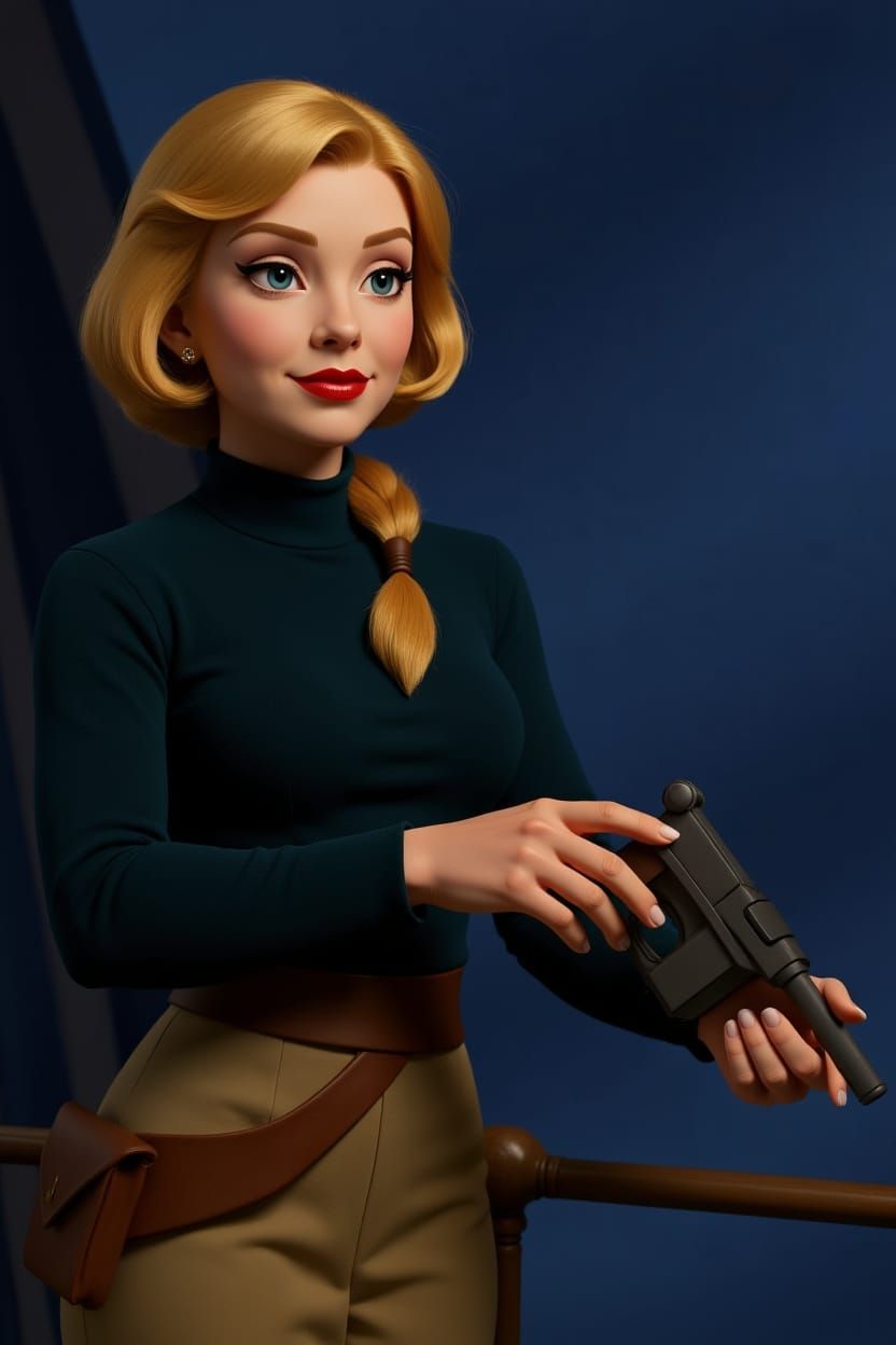 This image depicts Helga Sinclair from Disney's Atlantis: The Lost Empire. The artwork presents a realistic, retro, cinematic, and vintage aesthetic reminiscent of classic film.