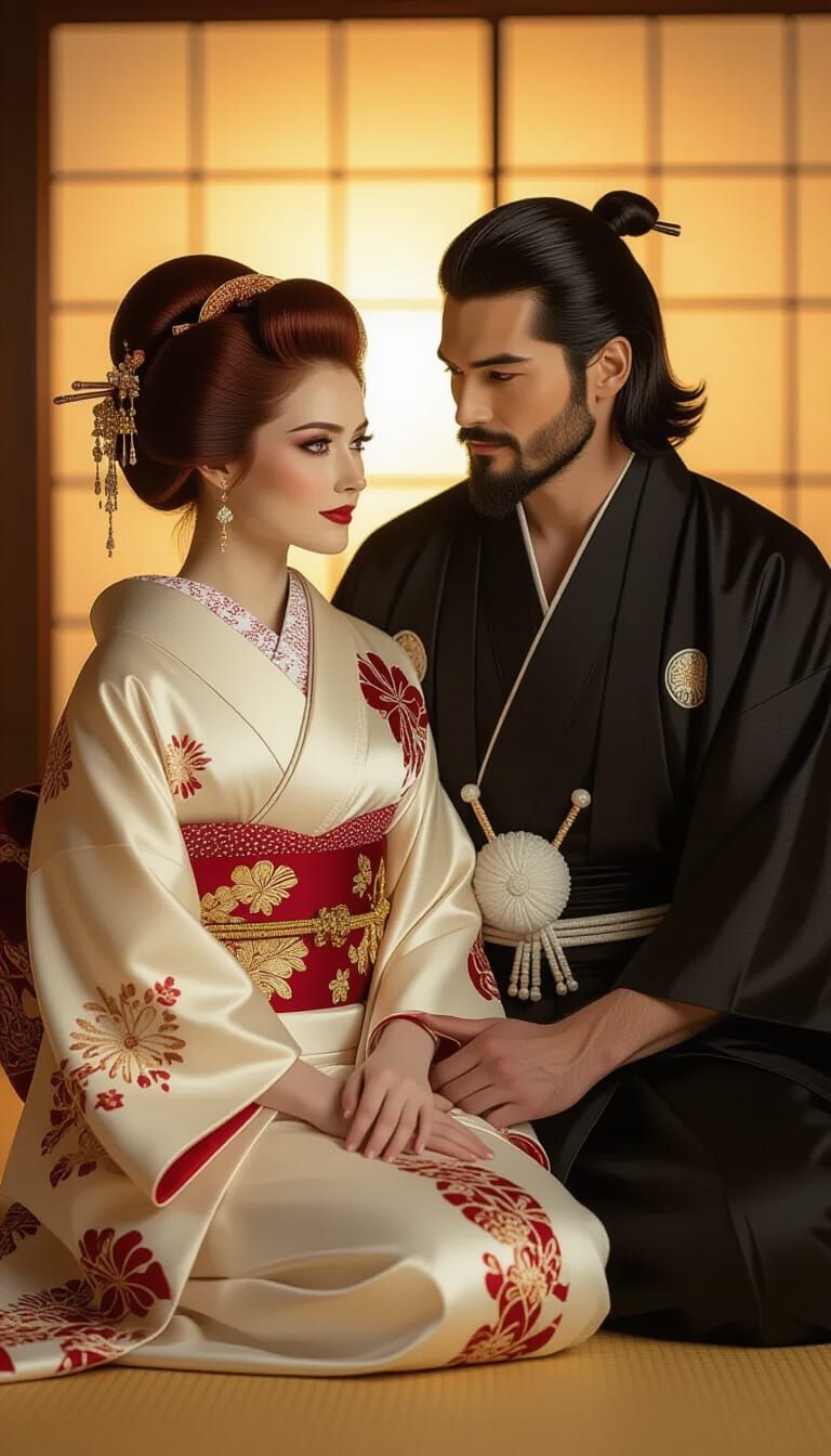 This image shows a Caucasian couple in traditional Japanese attire, gazing at each other with love. The woman's burgundy hair and the couple's satin kimonos are illuminated by soft, golden light, as 3D rendered digital art.