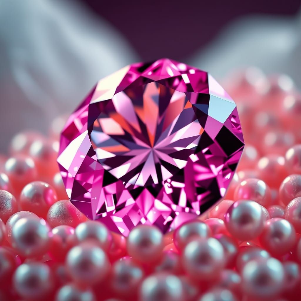 A stunning image of a pink diamond surrounded by delicate pearls, reflecting light with intricate facets in a hyperrealistic, cinematic scene.