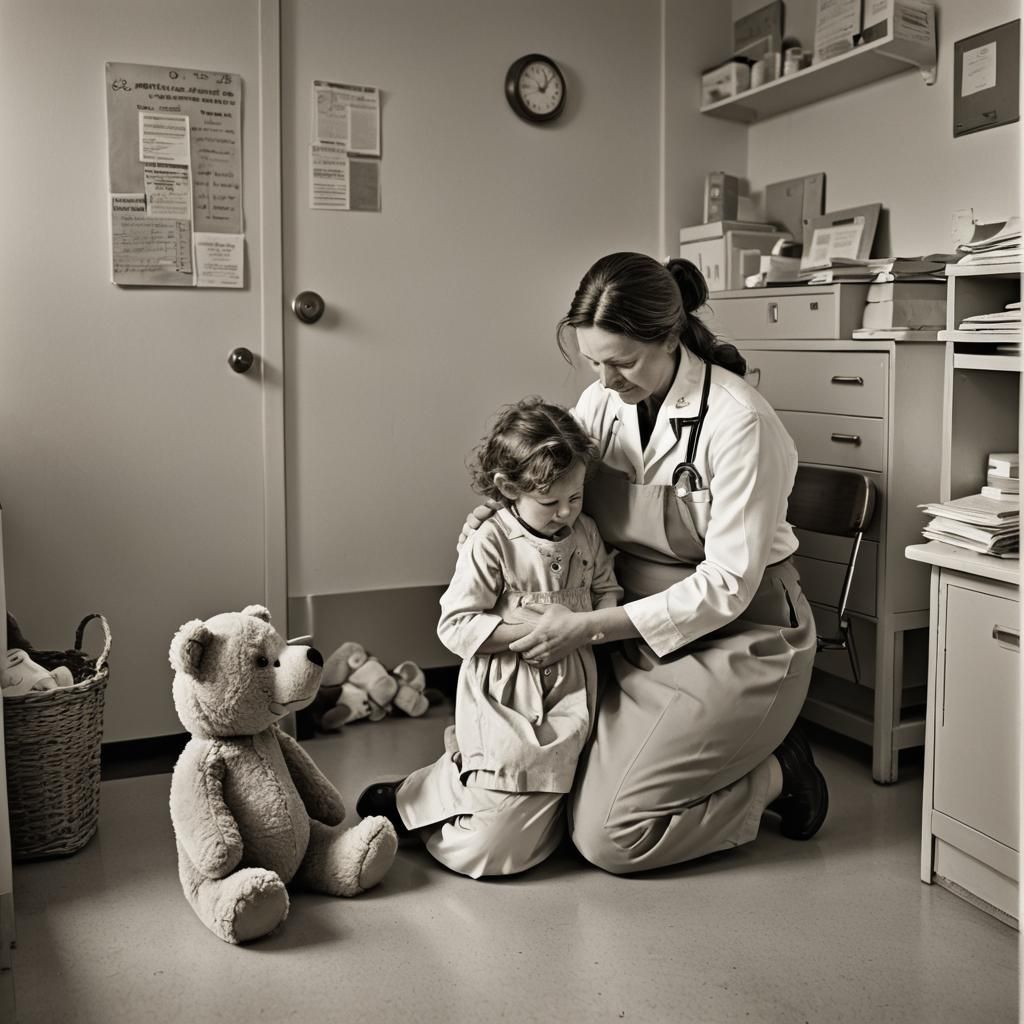This image shows a comforting school nurse tending to a crying child with a scraped knee. The artwork is reminiscent of comic book art, with stylized lines and vibrant colors that capture the scene's emotional depth.