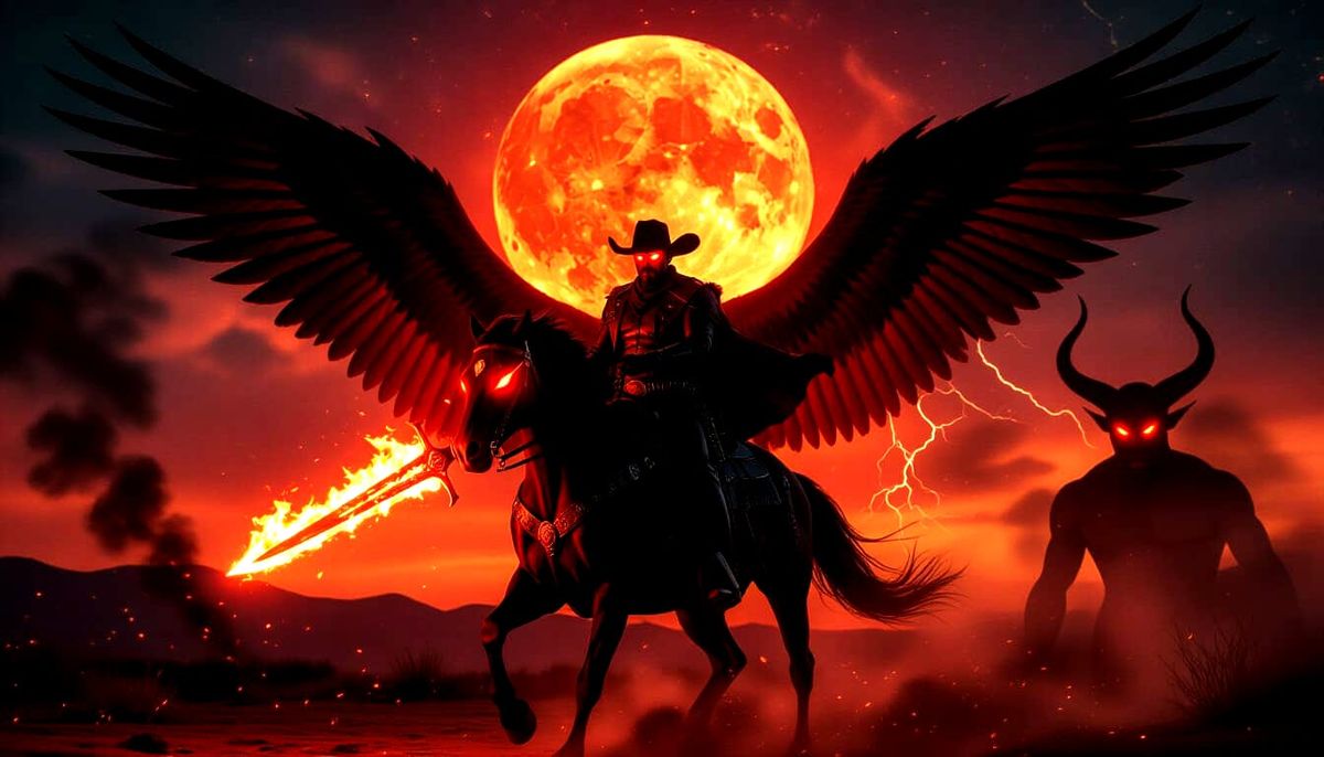 This cinematic dark fantasy image shows a cowboy with a glowing sword riding a winged demon horse under a stormy red moon. Dramatic and photorealistic, it blends Western grit with epic heroism.