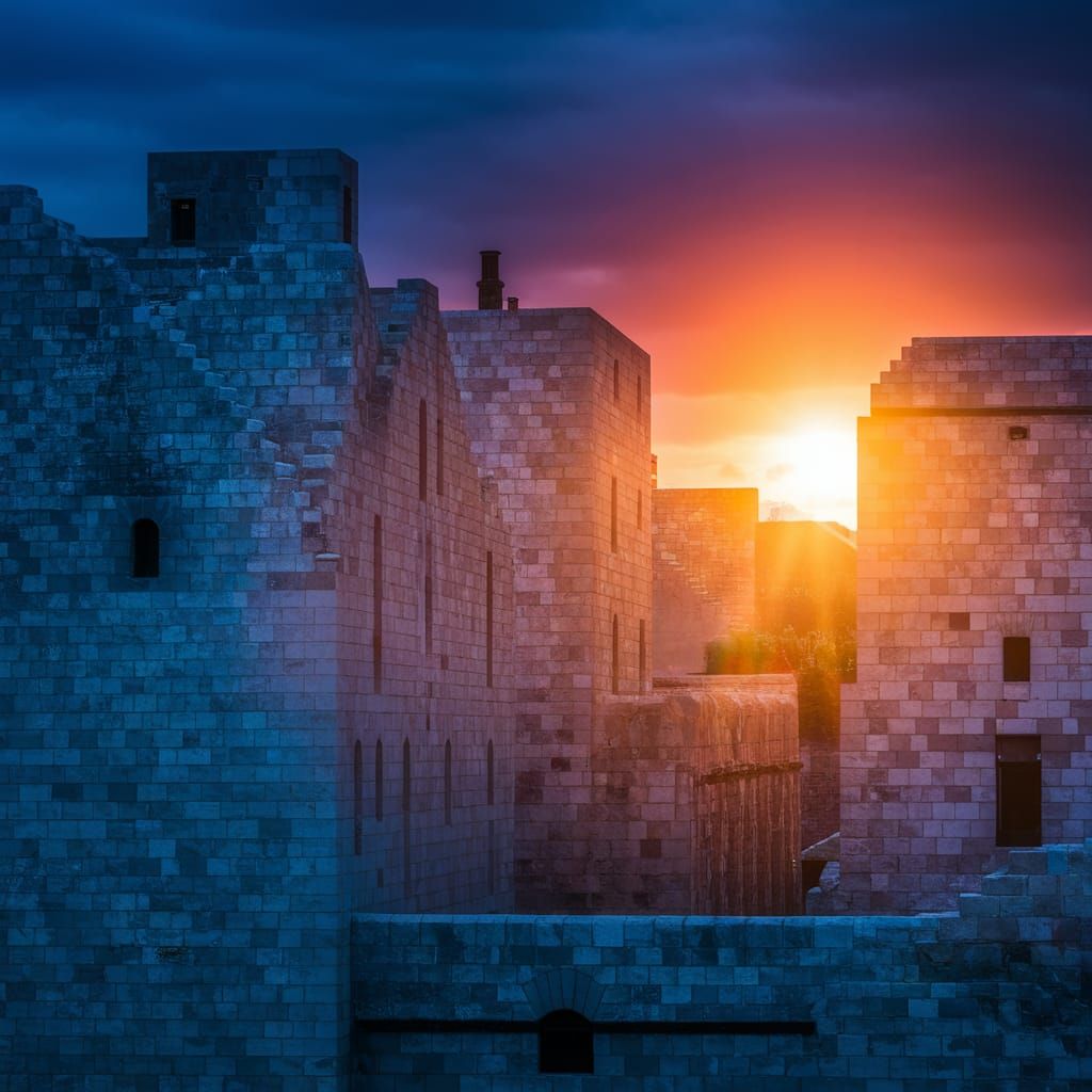 A photograph captures the sun setting over Larnaca in North Cyprus, highlighting the ancient stone structures with a warm, golden light. The high-contrast image showcases the historic buildings against a vibrant sky.