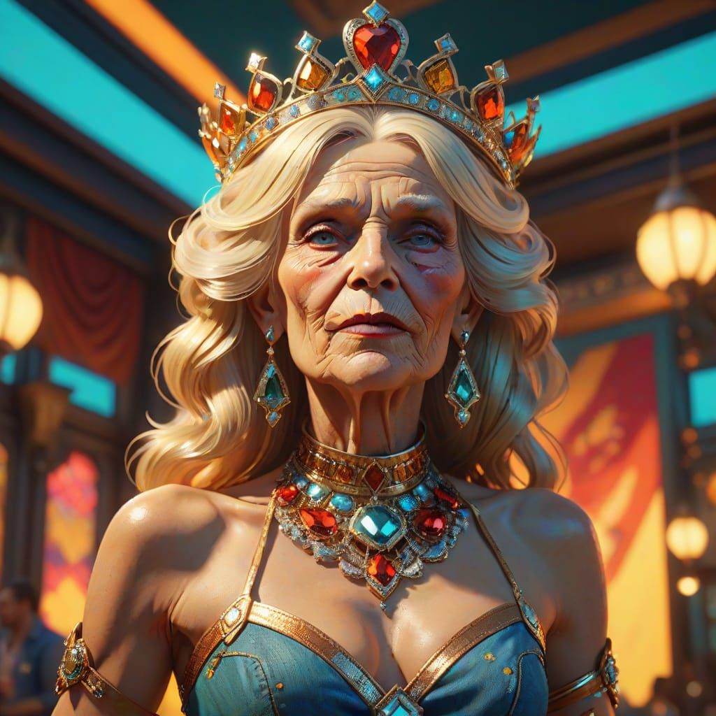 This image showcases a stunning, hyper-realistic digital art piece featuring an 80-year-old transvestite queen, crowned Miss Trailer Trash, in a vibrant Art Nouveau-inspired setting. The subject's elaborate, peroxide-blonde hair shines under dynamic lighting, complemented by intricate, Alphonse Mucha-ins...