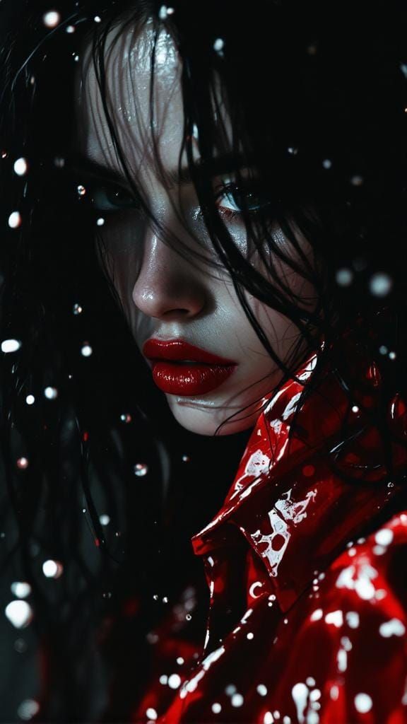 A striking picture of a woman with graphite-colored skin, drenched and wearing a red shirt. The image blends art and fashion in a dreamcore style, with monochromatic tones and a pop of red.