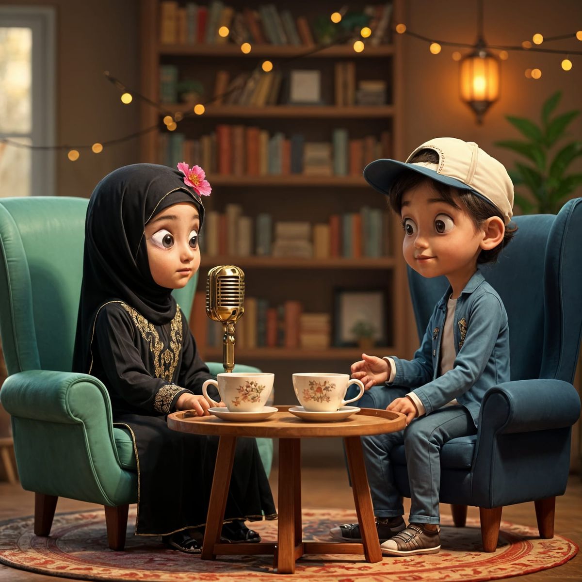 A charming image depicts Noor and Adam hosting the "Kiddo Podcast" in a cozy studio. The scene is rich with detail, rendered in a Pixar-inspired 2D animation style with warm, cinematic lighting.