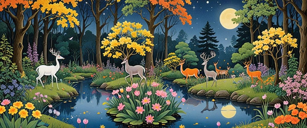 A charming folk art landscape of a tranquil forest clearing. The image features prehistoric flora and fauna in a soft, dreamy color palette, rendered in a naive style. The scene is bathed in indigo light.