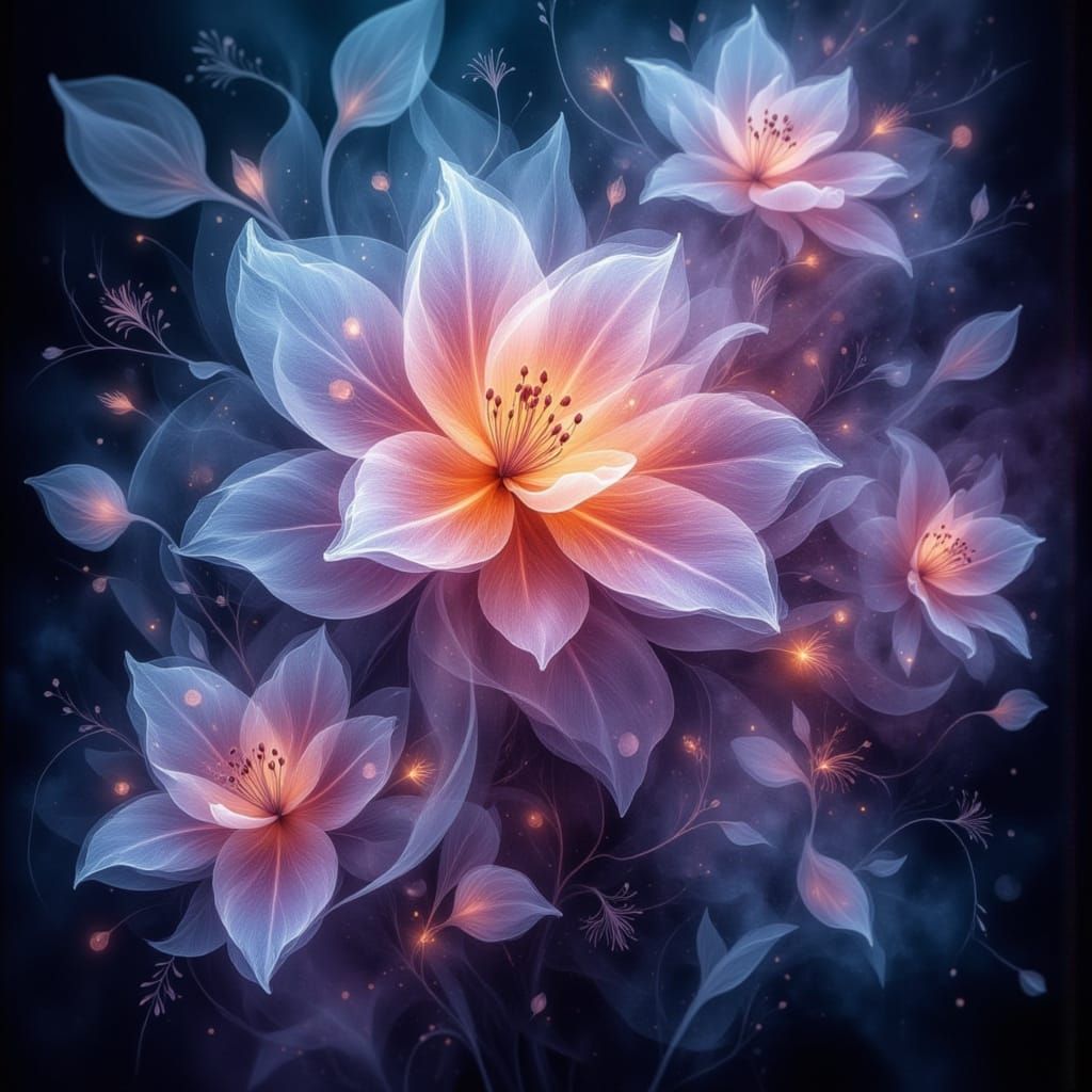 A surreal image featuring glowing, ephemeral blooms in a neon-lit, distorted landscape. The picture showcases vibrant, shimmering colors and futuristic cyberpunk elements, creating a glitch art aesthetic.