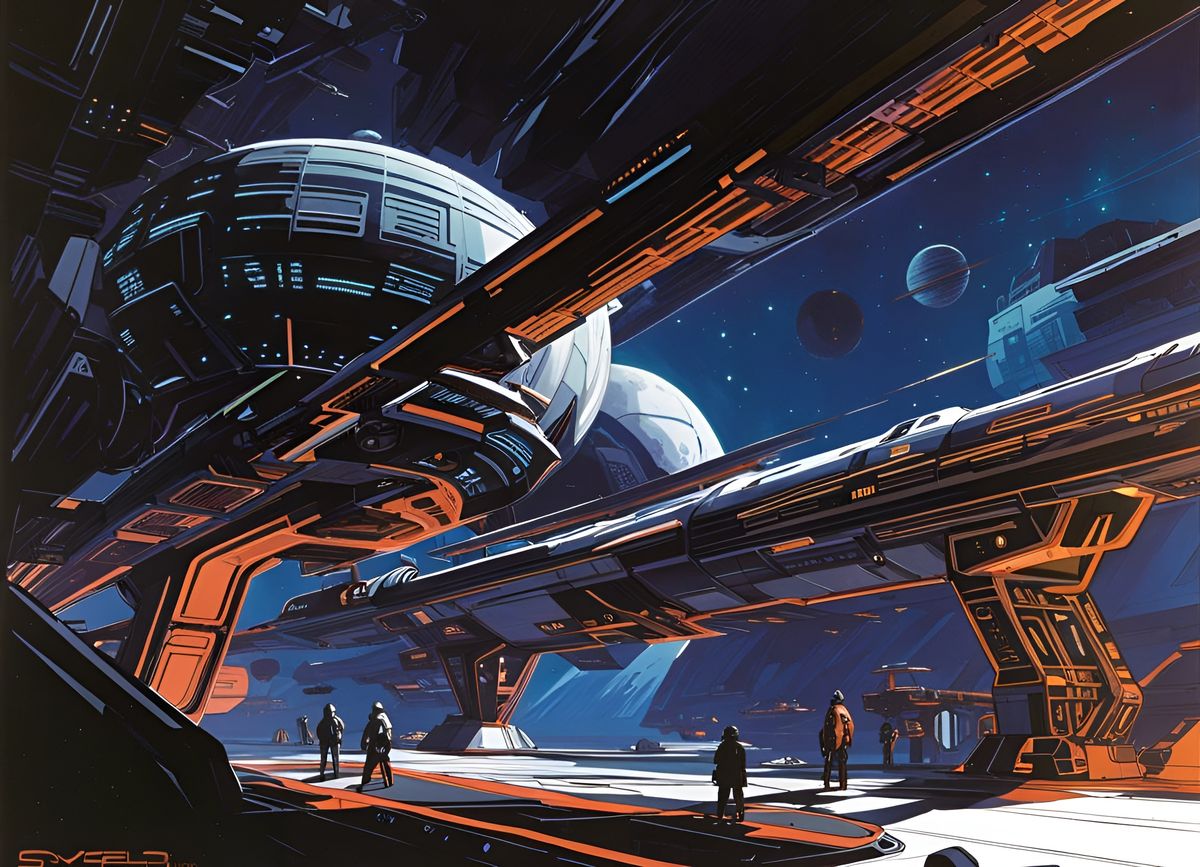 This image depicts a futuristic space station set against a vibrant galaxy backdrop. The artwork showcases a cyberpunk aesthetic, reminiscent of concept art.