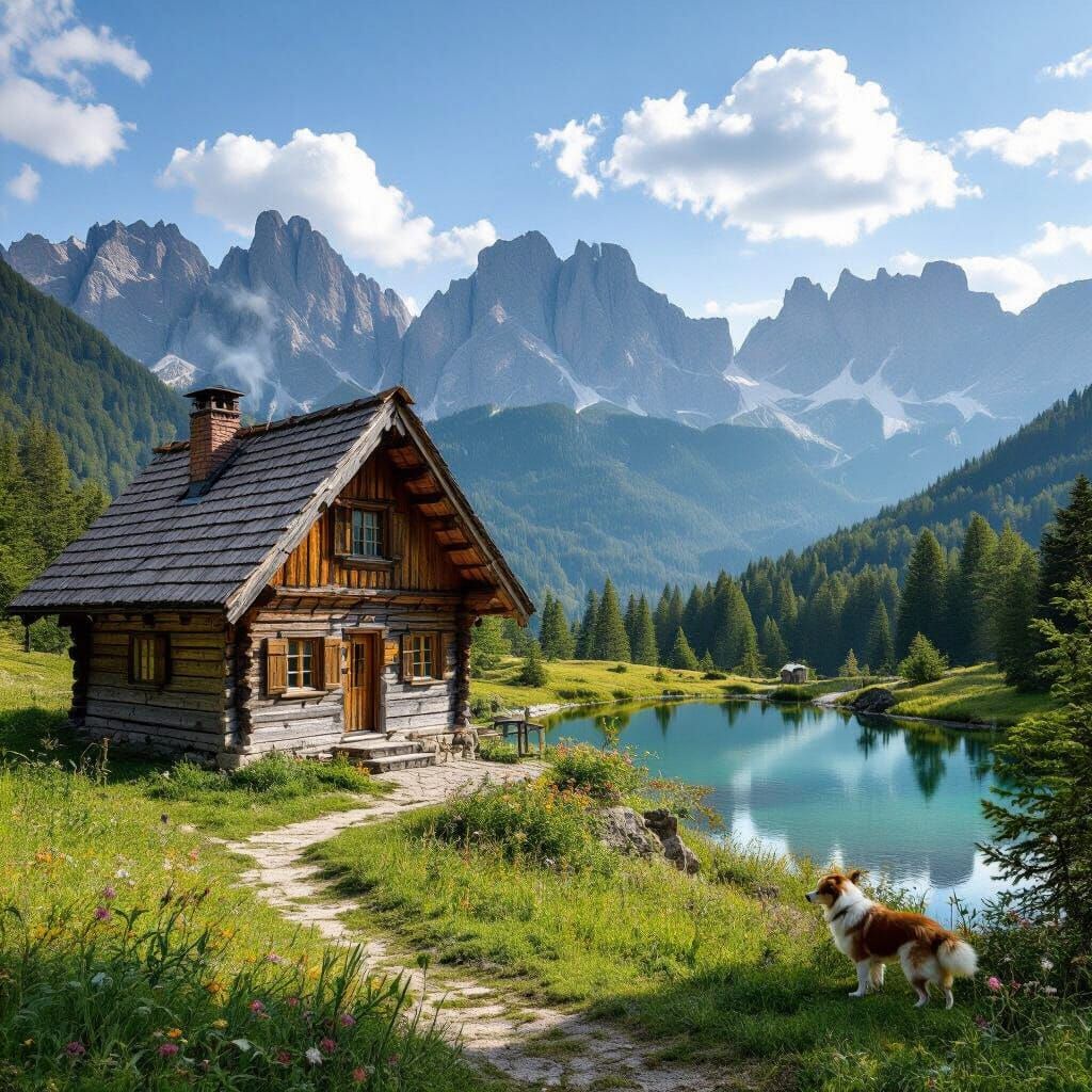 This image shows a traditional wooden cabin nestled in the Dolomites mountains. The serene landscape includes lush forests, a tranquil pond reflecting the sky, and a stone path leading to the cabin, rendered with a blend of impressionism and realism.
