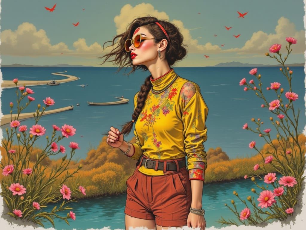 This image features a woman walking past a vibrant pier with a subtle blend of Art Deco and Eastern influences, set in a dreamlike atmosphere.