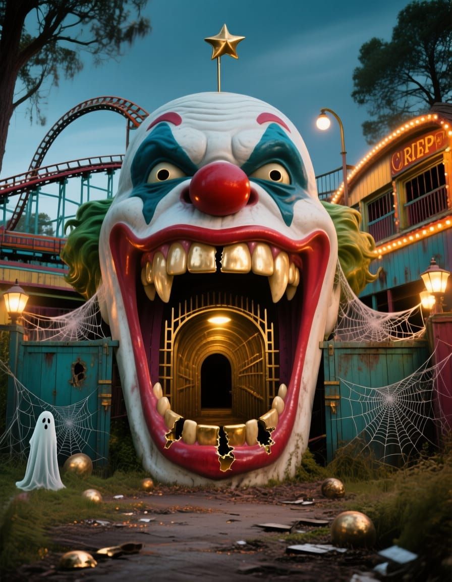 brass fillings in the giant mouth of the spooky clown entrance gate to Corridors of Contempt minitrain ride in The Olde Abandoned Amusement Park™️cobwebs dust litter flickering lights all the schmeer you'd expect to find in The Olde Abandoned Amusement Park™️with maybe even some ghosts and stuff