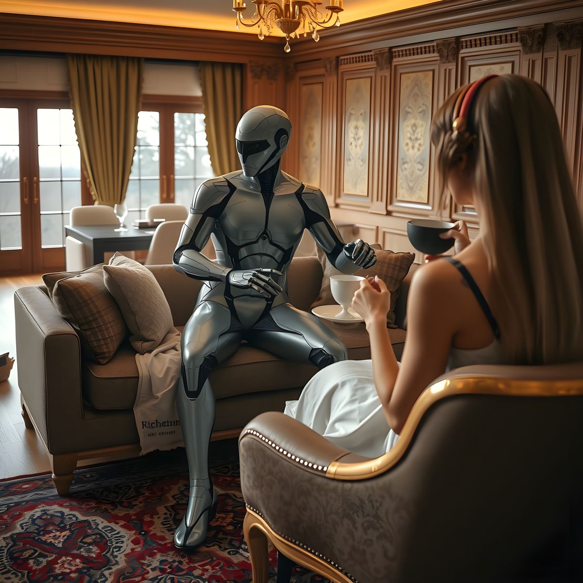 A close-up image of an android man in a Rhenium bodysuit relaxing on a couch in an Alpine living room. The lighting and decor create an intimate, romantic ambiance with a futuristic aesthetic.