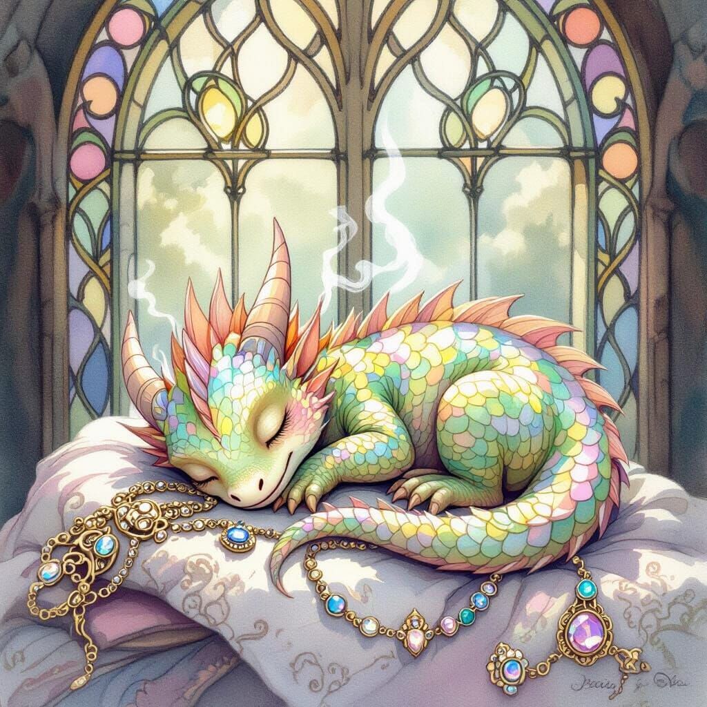 A charming image shows a miniature baby dragon asleep on a hoard of antique jewelry. The dragon's scales reflect pastel colors in soft light reminiscent of classic children's book illustrations.