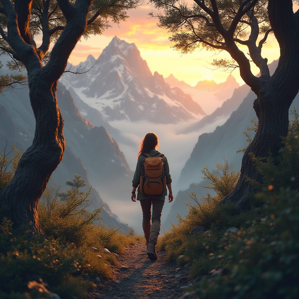 This image shows a woman walking away from the viewer, surrounded by ancient, gnarled trees and majestic mountains, set against a breathtaking sunset backdrop, evoking a sense of mysticism and wonder, with intricate details and deep, rich colors.