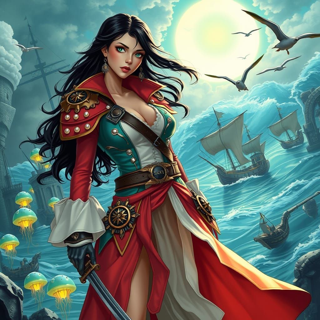 A striking picture of a fierce female pirate in an oceanpunk harbor. The pirate wears a stylized coat with iridescent accents, coral shoulder armor, and sea-glass earrings in a surreal blend of industrial and organic elements.