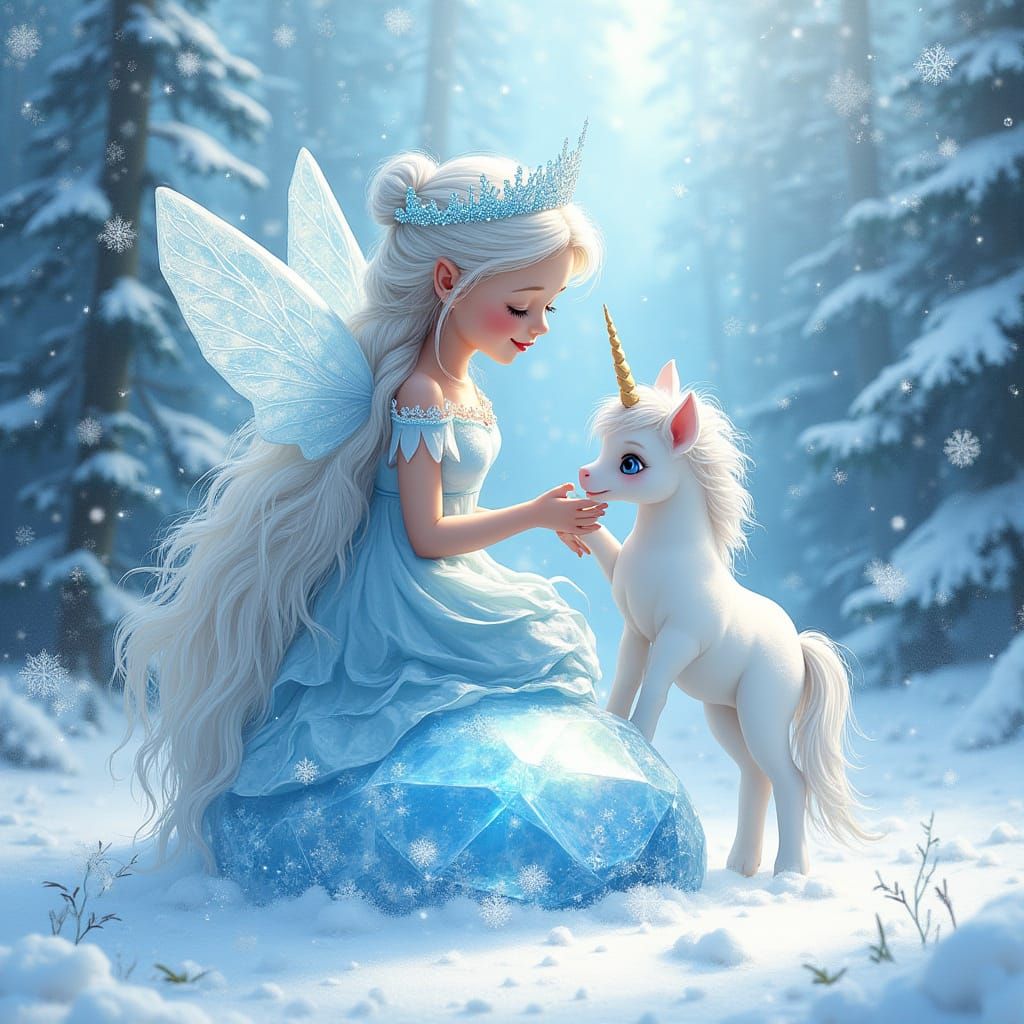 A magical scene of an ice fairy on a crystal throne in a winter forest. The fairy is accompanied by a baby unicorn in this digital art piece with meticulous detail.