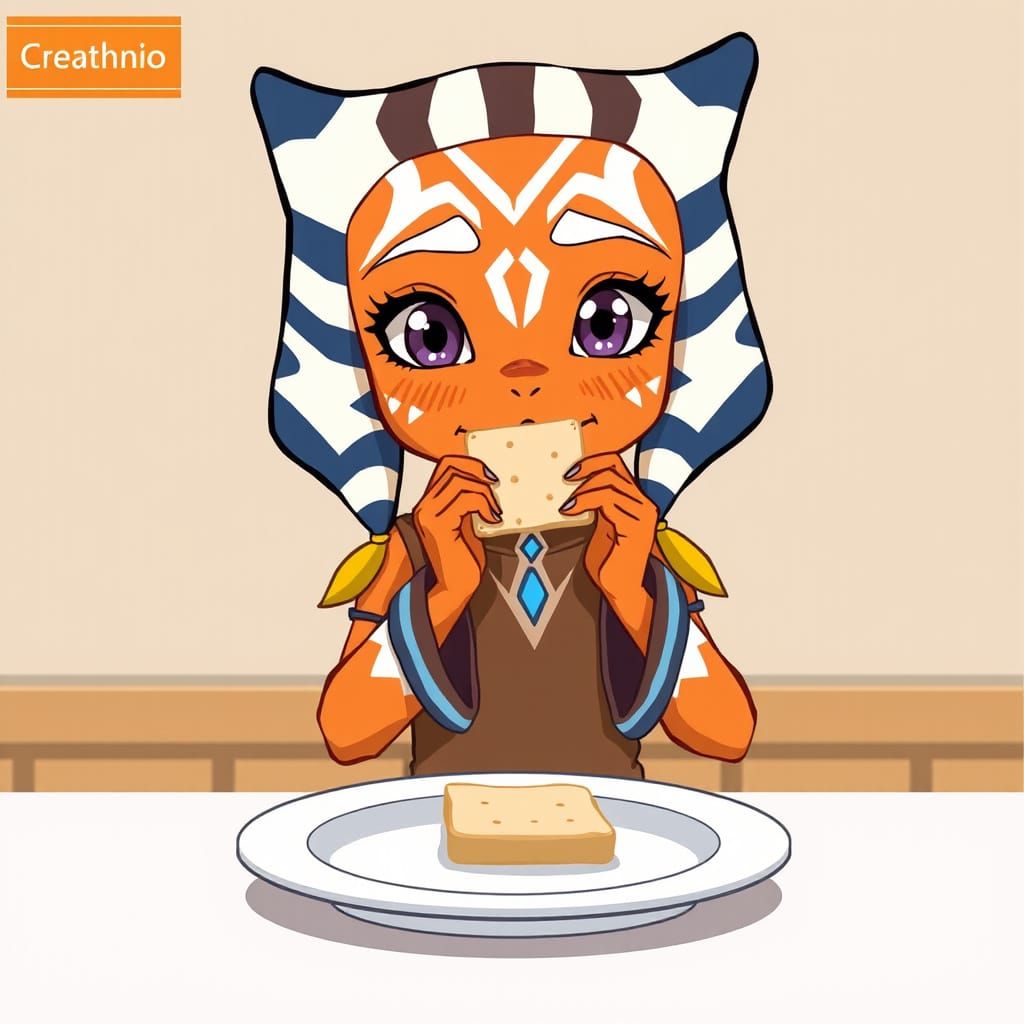 This image shows a cartoon of young Ahsoka Tano eating. She has orange skin, large purple eyes, and striped head-tails. Her outfit is brown with white accents. The background suggests an indoor setting.