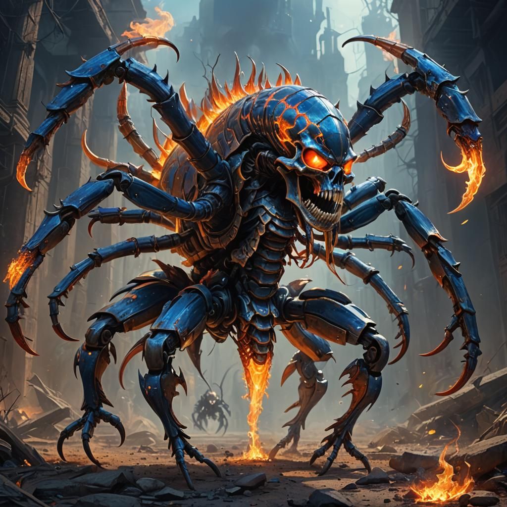 This image shows a formidable scorpion-like hybrid creature with a flaming skull. The creature features spectral blue and fiery orange colors in a detailed, fantastical matte painting, rendered in 8k resolution.