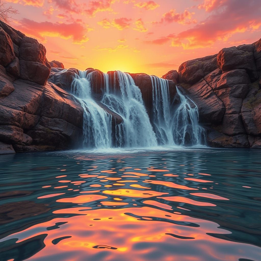 This image shows a breathtaking waterfall cascading into glass clear water, with a stunning sunset reflecting vibrant warm hues above, blending realism and fantasy elements in a captivating scene.