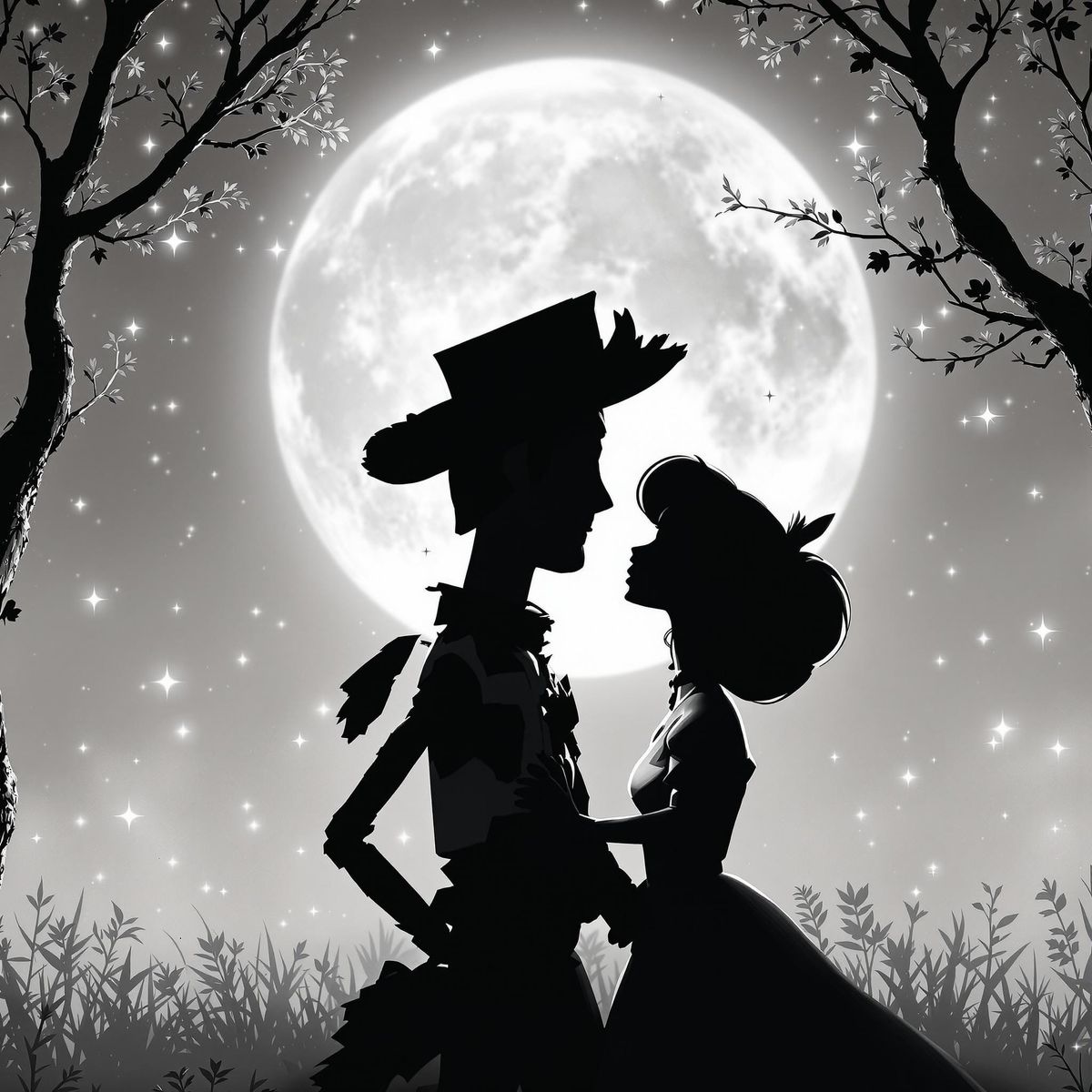 This image shows a poignant black and white silhouette of Woody and Little Bo Peep in a tender, dreamy scene, set against a soft moonlit backdrop with delicate tree branches and subtle stardust, in a classic Disney-inspired style with bold lines and nostalgic charm.