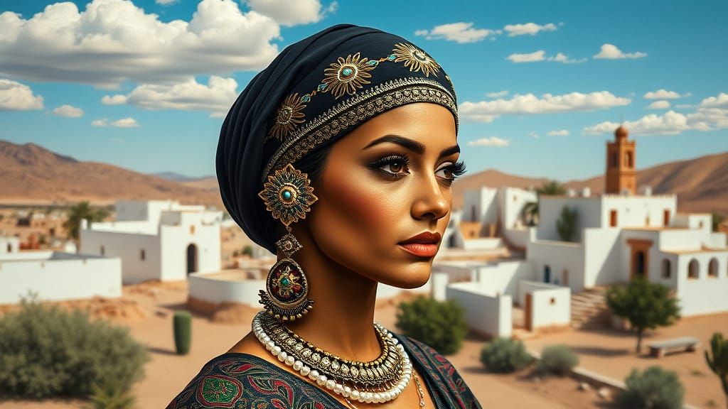 This image shows a Haratin woman with a Tassfift headband and bronze earrings, set against a Moroccan village. The artwork, reminiscent of cloisonné enamel, features bright metal separating the cells.