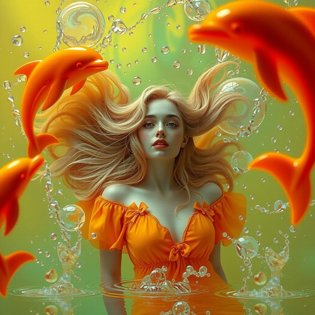 This image shows a woman with golden hair floating in a soda ocean. Gummy candy dolphins and candy sculpted dolphins swim around her in this surreal digital painting.