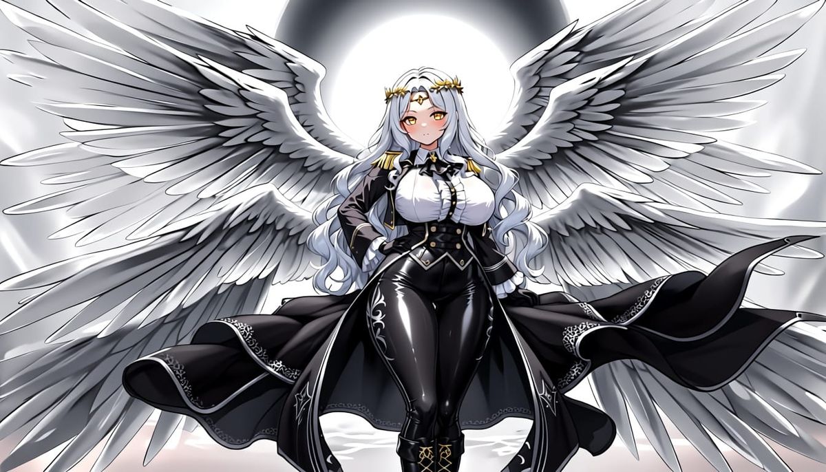 This image shows an angelic figure named Gabriel with twelve white wings, bathed in moonlight. She has striking gold eyes and wears a gothic-inspired black dress with intricate silver and gold details.