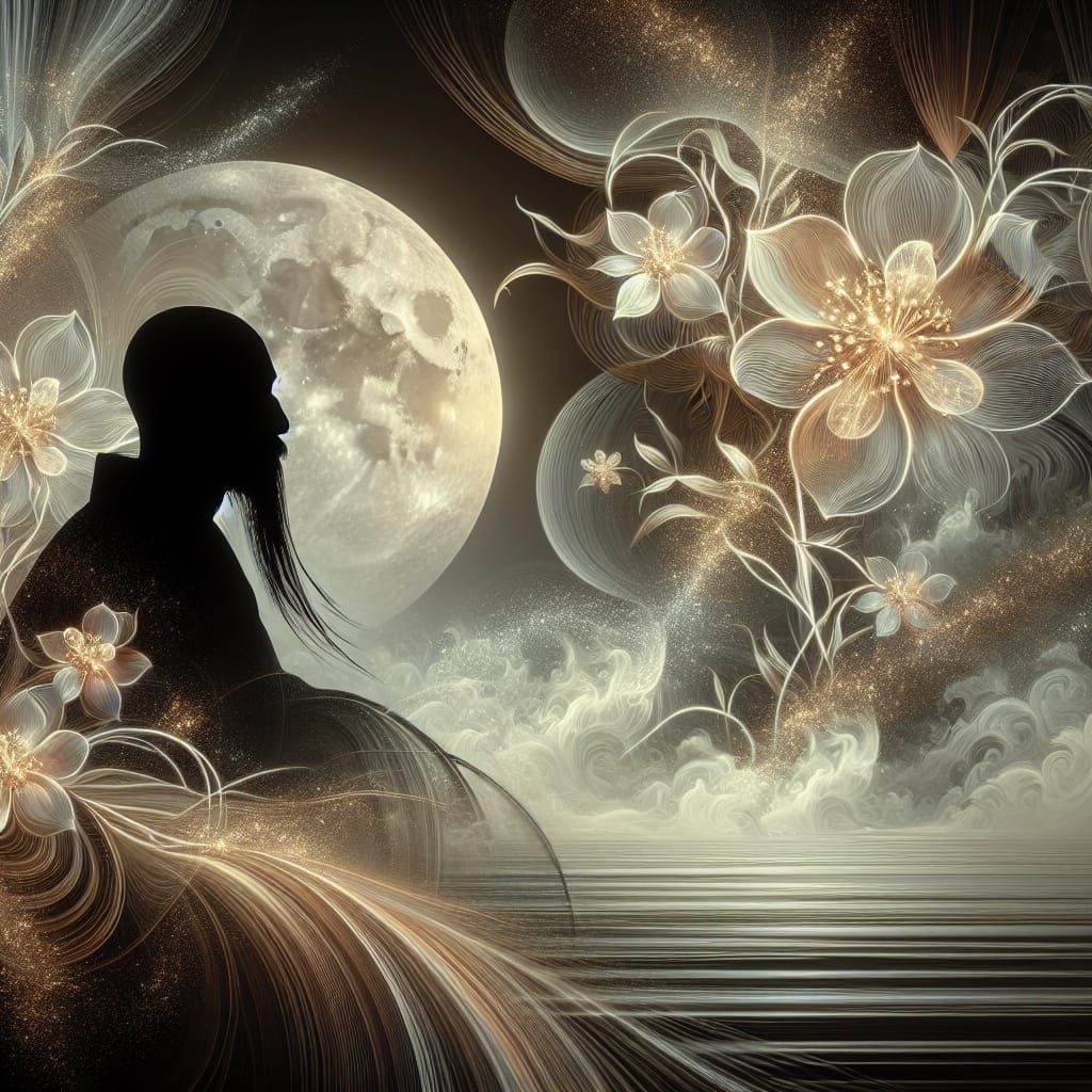 A striking picture of a silhouetted Shaolin monk against a full moon over the ocean. Ethereal briar wisps and transparent flowers accent the scene, rendered in a psychedelic style with fine ink on soft pastel shades.