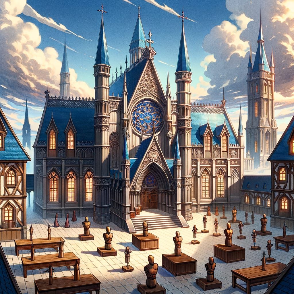 This image shows a Knight school classroom exterior in anime style. Gothic medieval architecture and training grounds are visible under a sky with dynamic clouds. The artwork has a fantastical, immersive aesthetic.