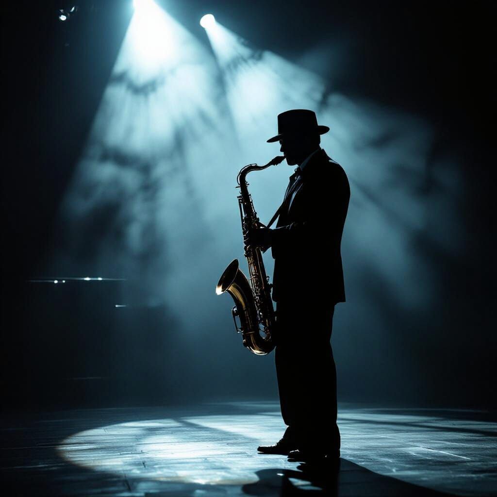 A dramatic image of a lone saxophone player on a smoky stage. The scene is reminiscent of classic film noir, with heavy grain and moody lighting in a cinematic style.