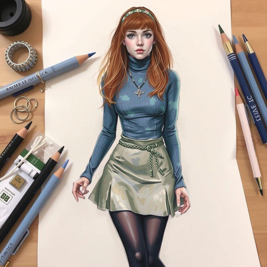 A pencil sketch of a Claudia Jessie lookalike dancing with a man. The woman has pale skin, gray-blue eyes and is wearing a miniskirt and boots in an art nouveau style.