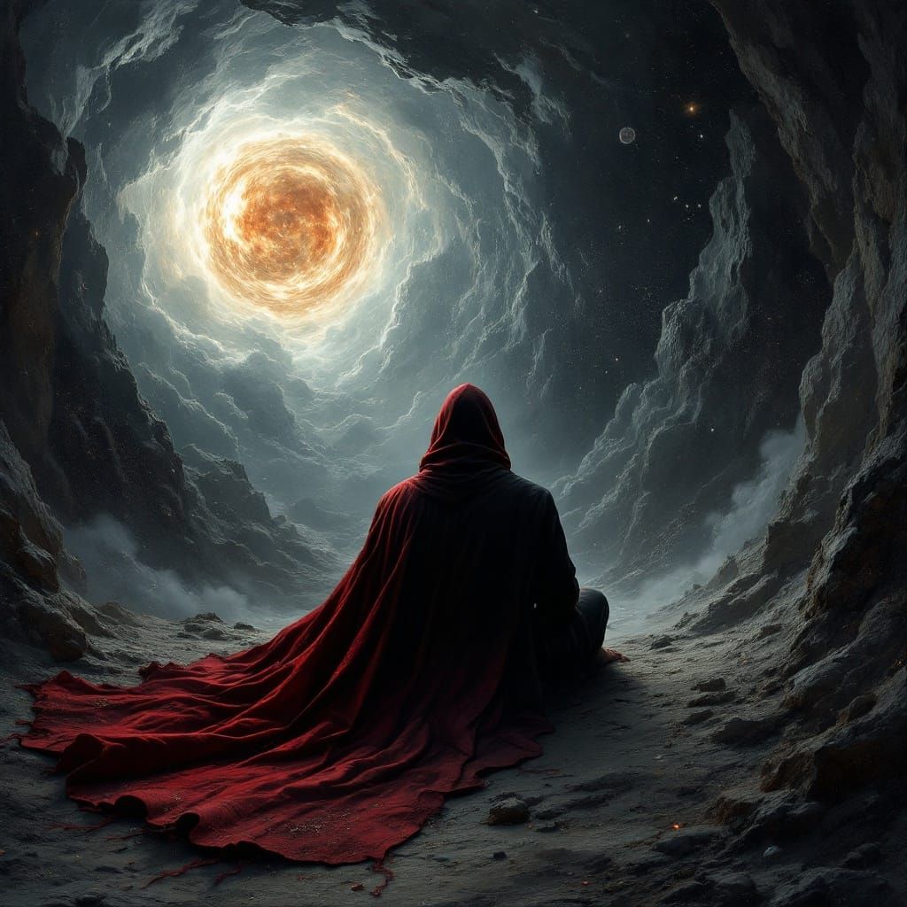 This image shows a dramatic and suspenseful cosmic scene with bold black, white, and red colors in a Mannerist aesthetic.