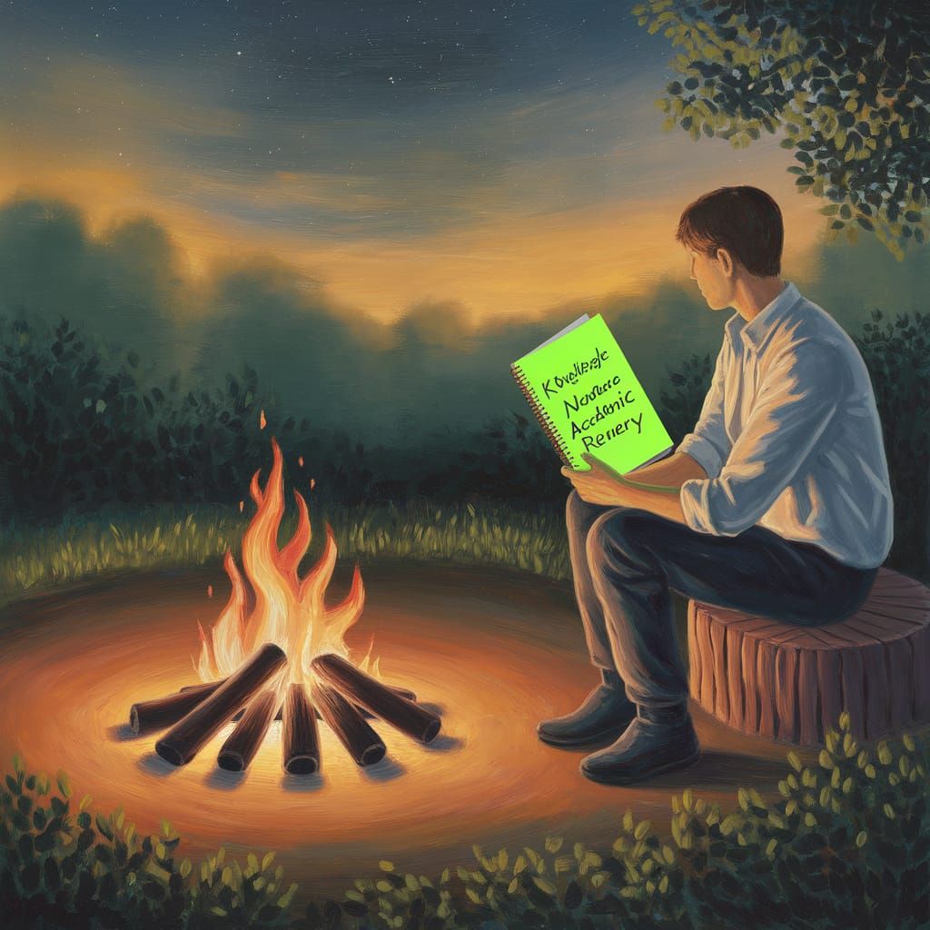 This image shows a person camping, sitting by a fire under the stars while holding a glowing green notebook. The oil painting aesthetic features warm colors and highlights the contrast of neon green.