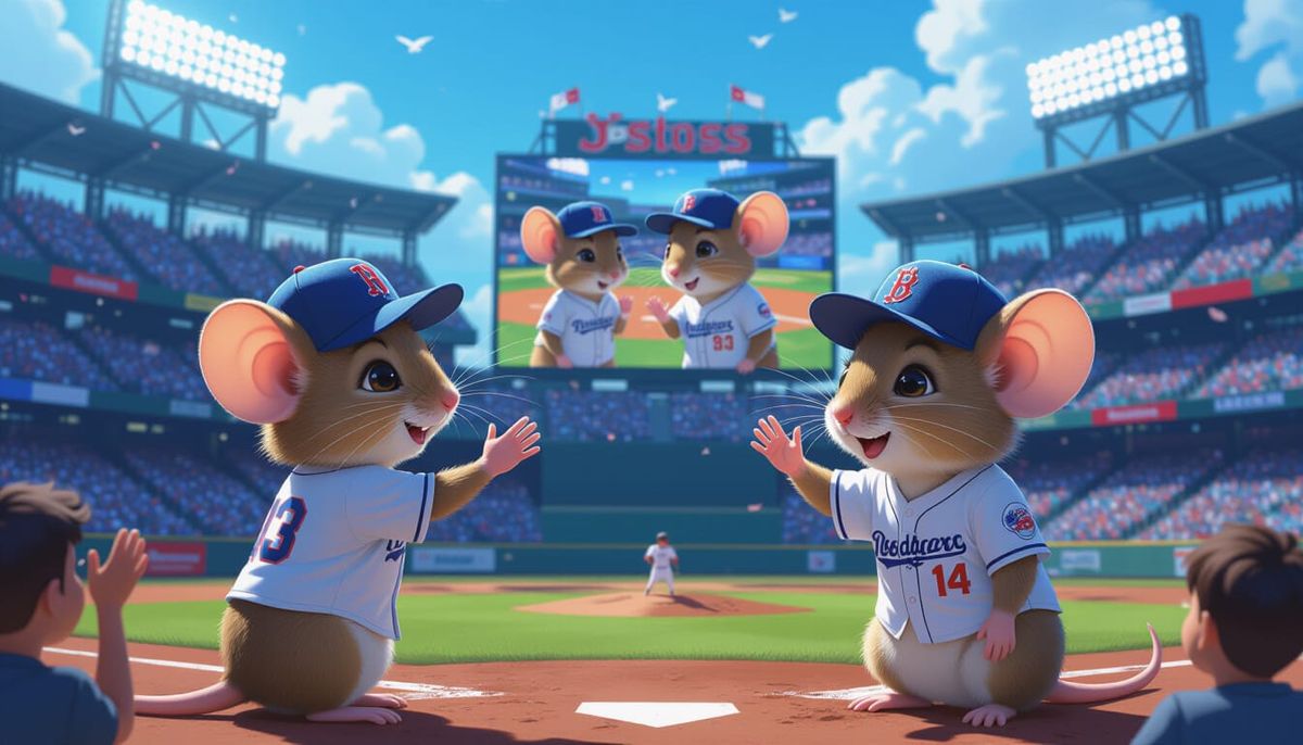 This image shows two cute mice wearing baseball uniforms, waving shyly to a stadium crowd. Captured by the kiss cam, the scene is vibrant and electric, with whimsical and dreamy elements.