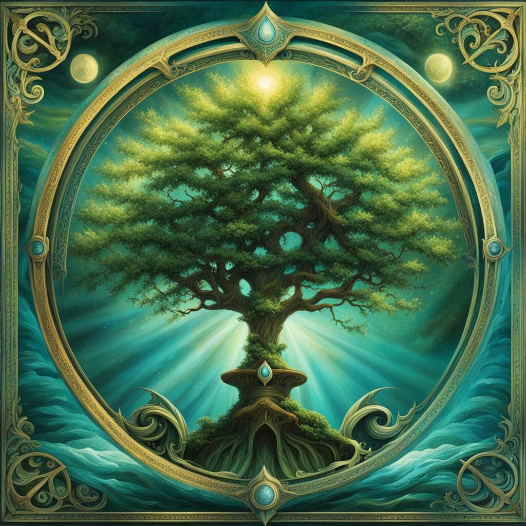 A digital portrait of Aquamora, a divine entity embodying life, death, and rebirth. The artwork showcases the cyclical nature of existence with water elements.