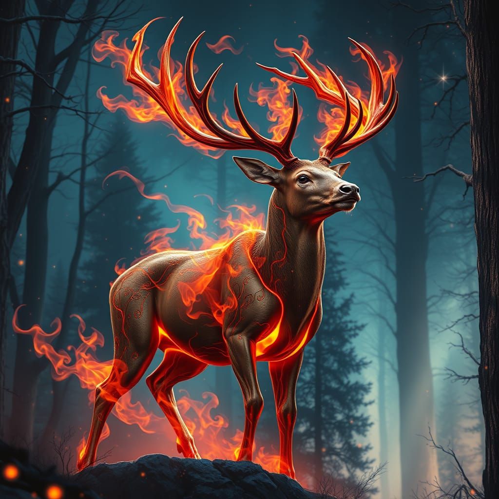 A photorealistic image of a stag composed of fire standing in a magical forest. Twinkling starlight illuminates the scene, creating a mystical and detailed landscape in a vibrant and ethereal style.