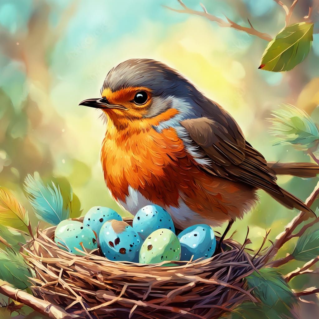 A close-up cartoon image shows a robin gazing at its nest filled with eggs. The digital painting style features vibrant colors, soft focus, and warm sunlight, creating a whimsical and joyful scene.