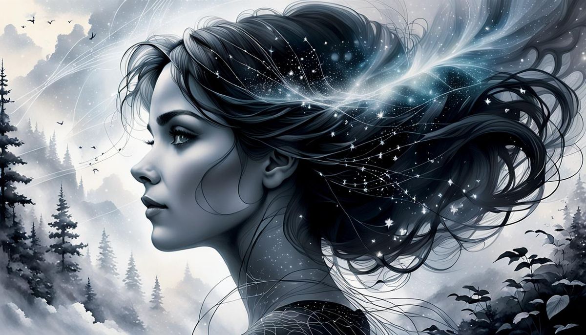 This image is a detailed and dreamy depiction of a woman's face in profile, set against a white background. The delicate lines that form her features blend seamlessly together, creating a sense of continuity and ethereal beauty.