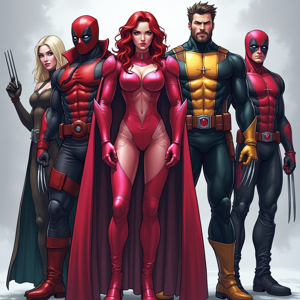 This image features a gathering of iconic Marvel superheroes including Emma Frost, Deadpool, Scarlet Witch, Wolverine, and Iceman in a dynamic composition.