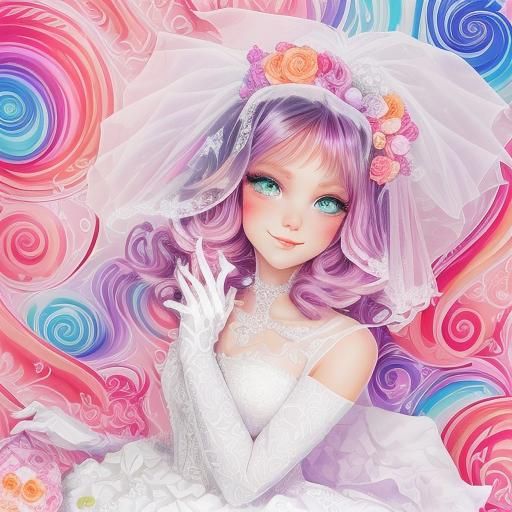 A vibrant portrait of a cat wedding with a white dress and veil. This image showcases a Candyland wonderland in a gouache style with detailed swirls of color.
