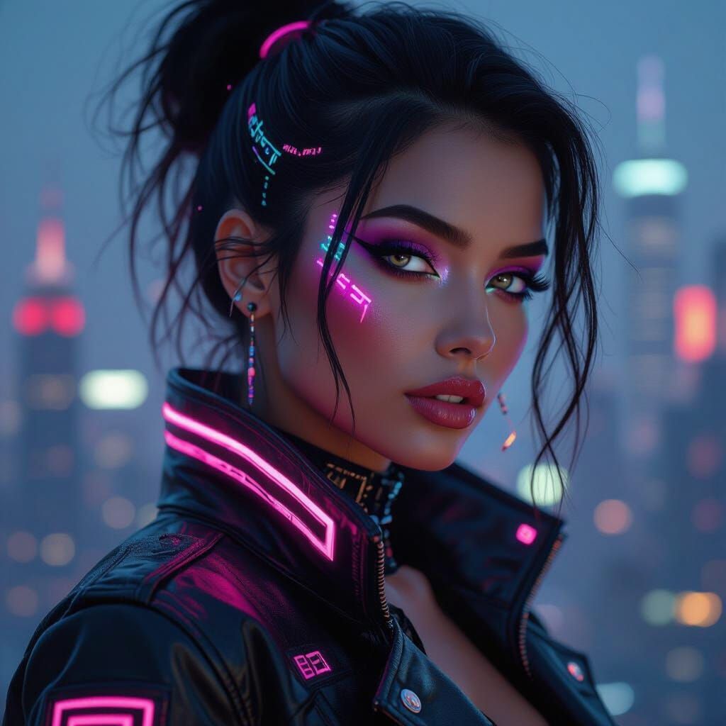 A striking image of a woman in cyberpunk fashion. She has neon makeup and a futuristic hairstyle, and the background shows a blurred, futuristic cityscape. The artwork is in a cyberpunk aesthetic.