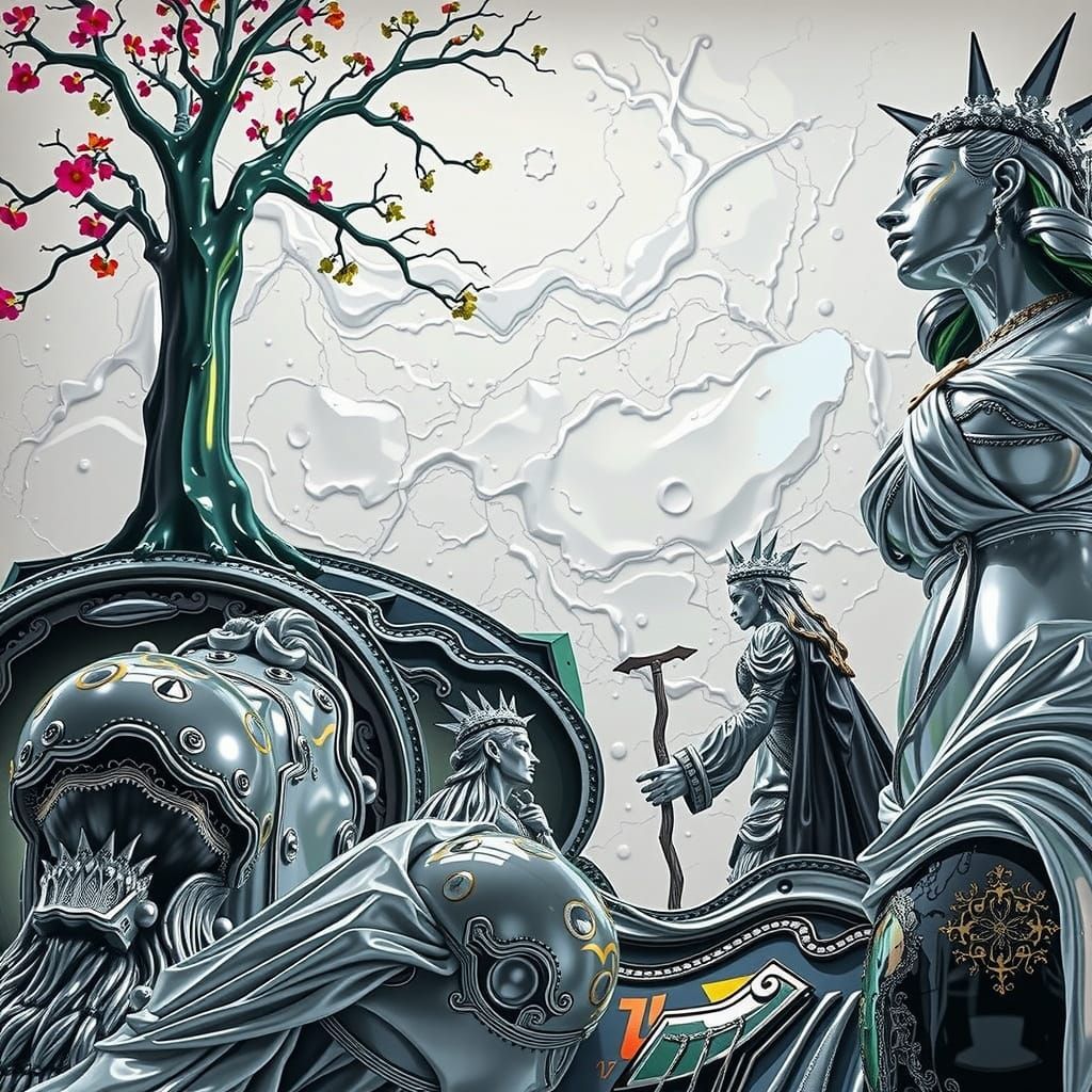 This image showcases a hyperrealistic sculpture bathed in intense, dynamic lighting. It features vivid red, green, yellow, black, and white hues with intricate textures.