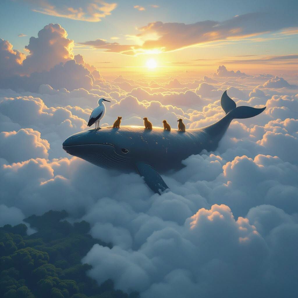This image shows a hyperrealistic scene from above, featuring a heron-like bird among bright clouds over a vast sea flooding a forest. A whale's tail emerges from the water, with various animals on its back, under a lonely sunset.