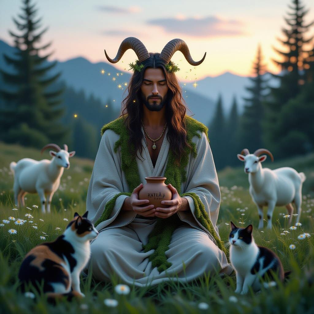 This image shows a serene, ethereal man kneeling in a meadow at twilight. He is surrounded by pine forests and goats, wearing moss robes, and holding a clay jar, rendered with photorealistic details.