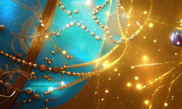 This image shows a golden ice rose surrounded by turquoise gemstones and reflected light, creating a jewel-like effect. The image is a detailed matte painting with deep colors.