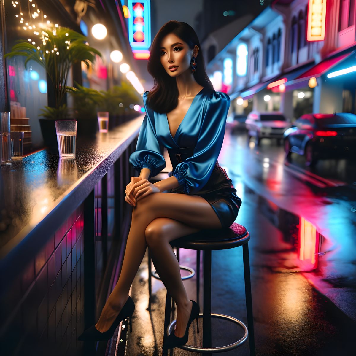 A sophisticated Singaporean woman in a blue silk blouse and black skirt waits on a bar stool. Neon lights reflect on the wet street during a rainy night, creating a vibrant atmosphere.